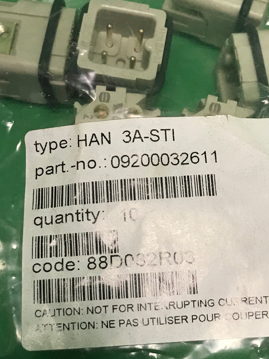 New in its original packagingRegular price €100,00 Exc VATRegular priceUnit price / perSale price €100,00HARTING HAN 3A-STI HAN3ASTI PART NO : 09200032611 BOX OF 10 UNITS